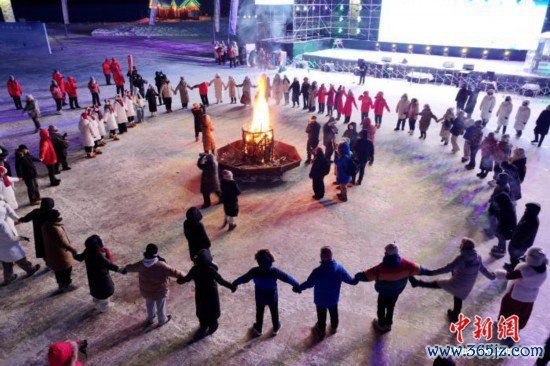 搭客和漠河市北极村住户手拉手围着篝火轻歌曼舞。 邵天李 摄